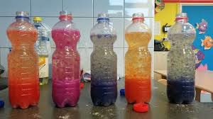 - Voeg olie, water en voedingskleurstof aan de fles toe. Vul de fles voor driekwart met plantaardige olie. Vul de rest van de fles met water en ongeveer 10 druppels voedingskleurstof